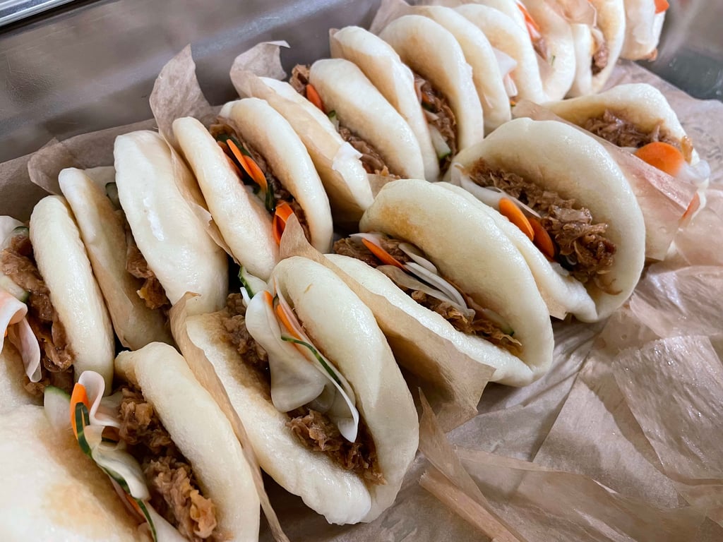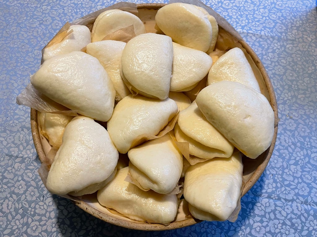 - Když bany trochu nakynou, nechte je 10 minut vařit v páře. Dá se použít rýžovar s patrem nebo obyčejný napařovák na knedlíky, který máme všichni doma. My doma dost improvizujeme - do rýžovaru se vejdou jen čtyři a na napařovák v hrnci šest, takže jich zvládneme udělat deset na jeden zátah. Po deseti minutách bany vyjměte z páry a nechte klidně vychladnout - jsou vynikající i jako studený sendvič. Pokud je chcete jíst teplé, budete si se zbytkem přípravy muset trochu máknout a trhané i omáčku mít ideálně hotové předem, ponecháné v teple.