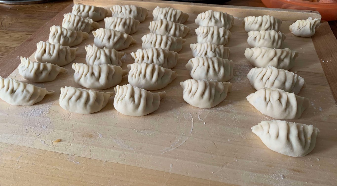 - Taštičky balíme tak, že si je překlopíme napůl, na jednom okraji stiskneme k sobě a pak postupně jednu stranu řasíme a přilepujeme k protilehlé rovné straně. Chce to trochu cviku. Idelání je mít minimálně 8 přehybů. Tato práce obnáší trpělivost a dobré naladění. Je to forma meditace, kvůli které tento pokrm připravujeme. Ideálně by se ho měla zúčastnit celá rodina.