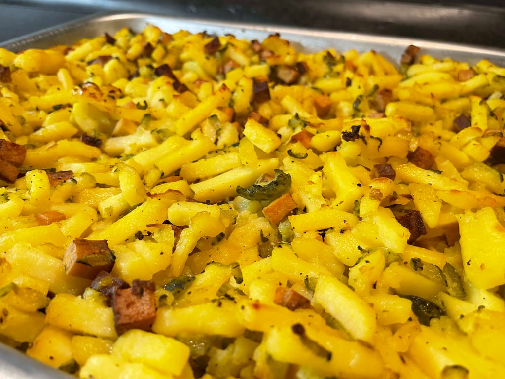 - Do zapékací mísy pomocí salátové mřížky vymačkáme nakrájené brambory, přidáme 12 g soli, 1,5 g pepře a rozmícháme s 12 lžícemi oleje. Poté přidáme osmažené tofu včetně oleje z pánve, který nese uzenou chuť a nastrouhané okurky.