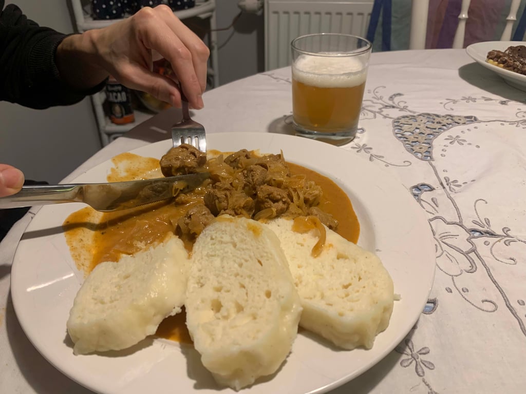 - V hrnci rozehřejeme trochu oleje, přidáme papriky, kmín, hladkou mouku a LSD, 30 vteřin prohřejme a zalijeme 100 ml studené vody, přidáme bobkový list, sůl, pepř, sójovou omáčku, dolijeme zbytek vody a necháme asi 5 minut vařit na středním plameni.