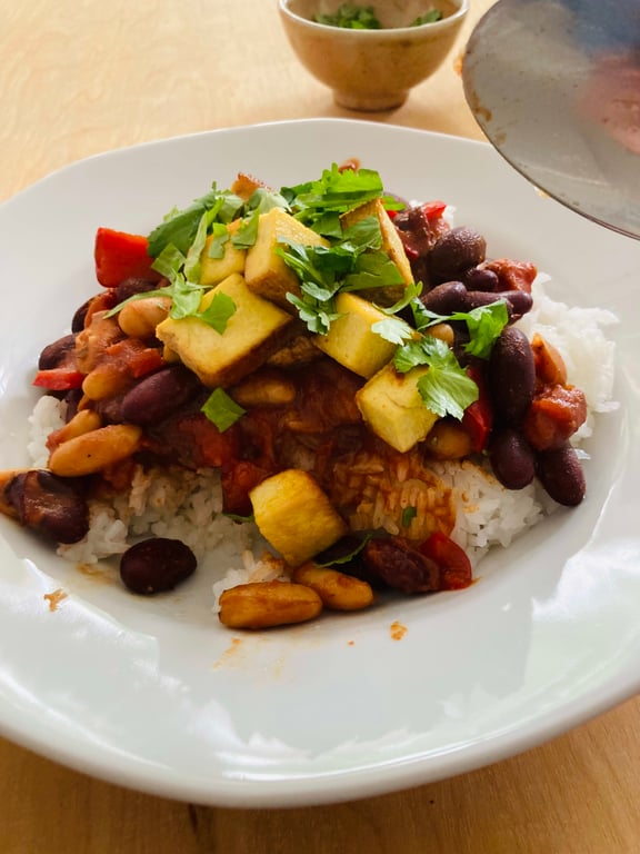 - Přilijeme 2 hrnky vody / vývaru, přidáme černé i bílé fazole, kukuřici, drcená rajčata, kakao, bobkový list, sójovou omáčku a na menší čtverečky nakrájenou papriku.