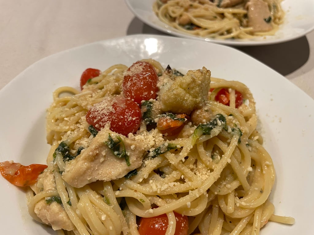 - Rovnou přidejte dvě hrsti mraženého nebo trochu víc čerstvého špenátu a promíchejte. V téhle fázi ještě přidám velkou sběračku vody z těstovin a dvě lžíce citronové šťávy. Do bešamelu pak pomalu přesunu pečený květák s cizrnou, případně opečená rajčata a promíchám. (Omáčka může být klidně trochu řidší, těstoviny jí hodně vypijí.) Naposledy doladím a dám do omáčky uvařené špagety. Promíchám a na talíři ještě posypu kešu parmezánem nebo opraženými ořechy.